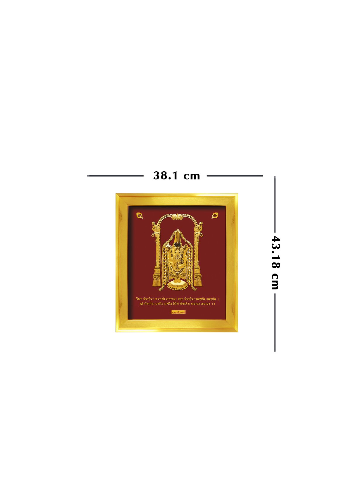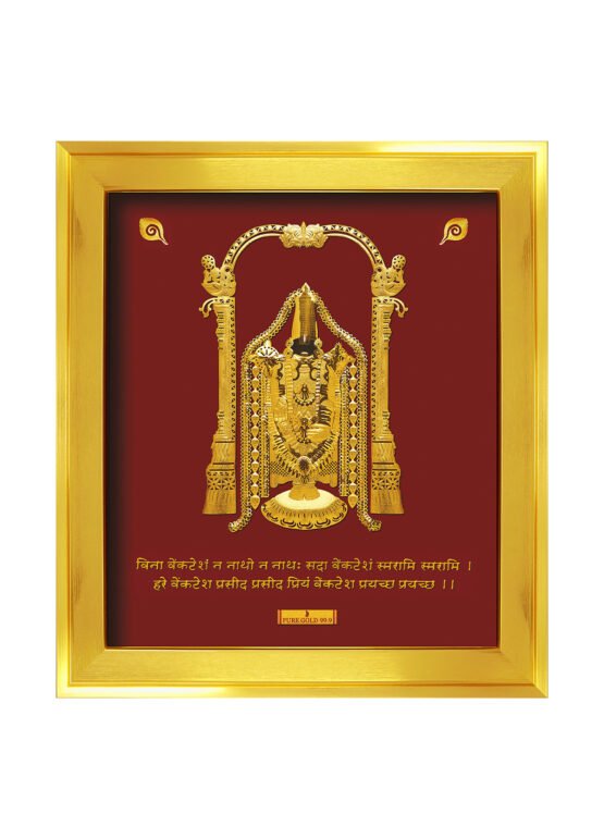 The artwork is framed by a rich, regal background that enhances Lord Balaji’s divine presence. The deep, vibrant colors of the background create a striking contrast with the gold detailing, symbolizing the deity’s power and spirituality. This carefully crafted backdrop enhances the overall impact of the piece, radiating a serene and devotional energy.